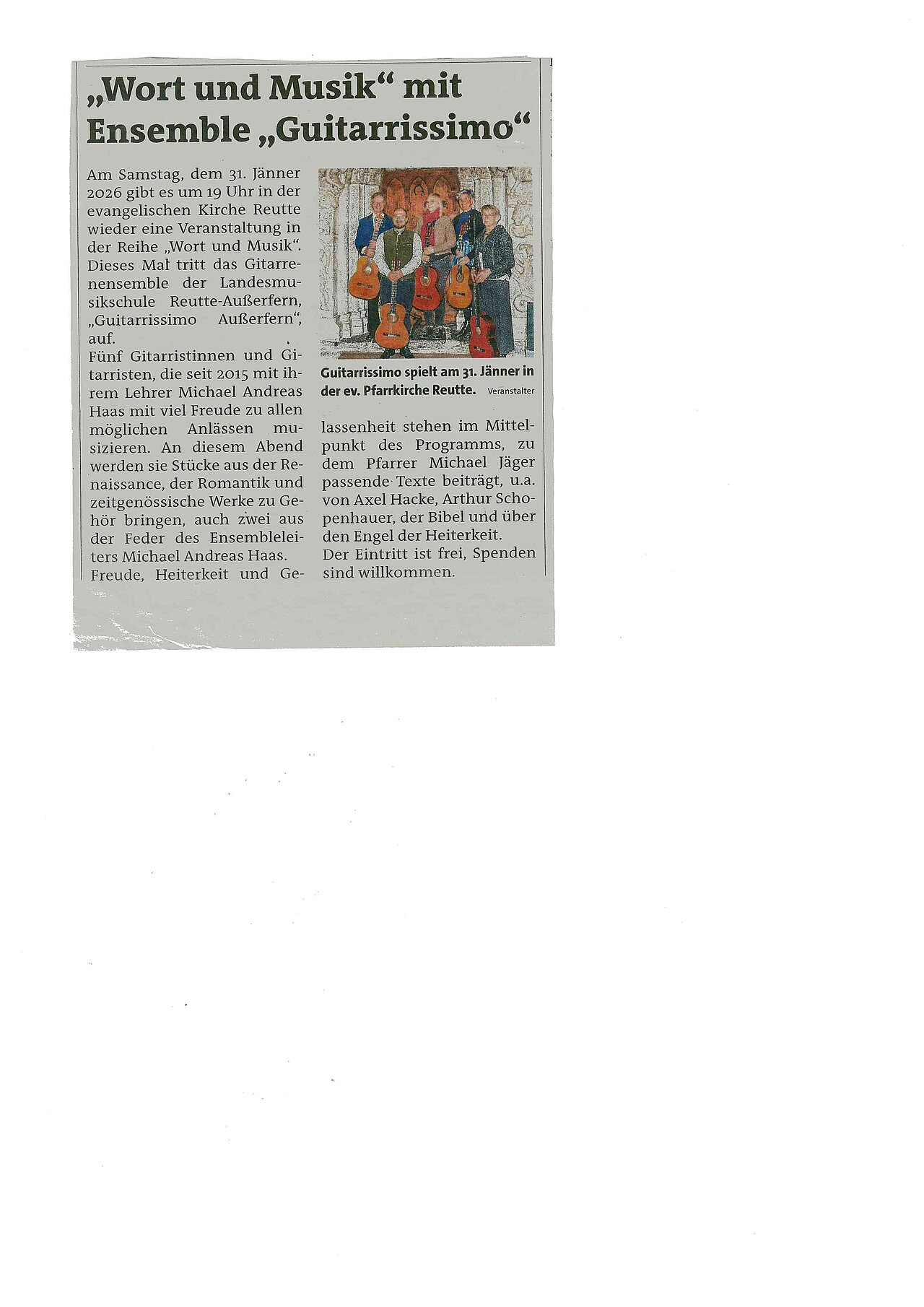Am Samstag, den 31 Jänner gab es in der evangelischen Kirche in Reutte eine Veranstaltung in der Reihe “Wort und Musik”