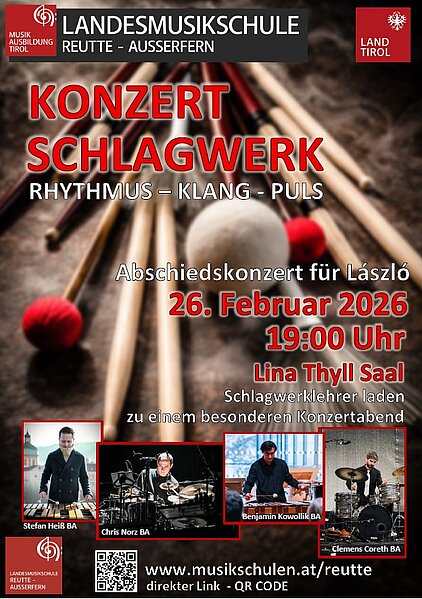 Anlässlich der Pensionierung von Schlagwerklehrer László Demeter luden die Lehrkräfte Benjamin Kowollik BA, Chris Norz BA, Clemens Coreth BA, und Stefan Heiß BA zu einem besonderen Schlagwerkkonzert mit Werken von Tom Gauger, Ruud Wiener, Rolf Wallin und Richard Filz. Zu hören sind Snare Drum, Marimba und Vibraphon in ihrer ganzen klanglichen Vielfalt.